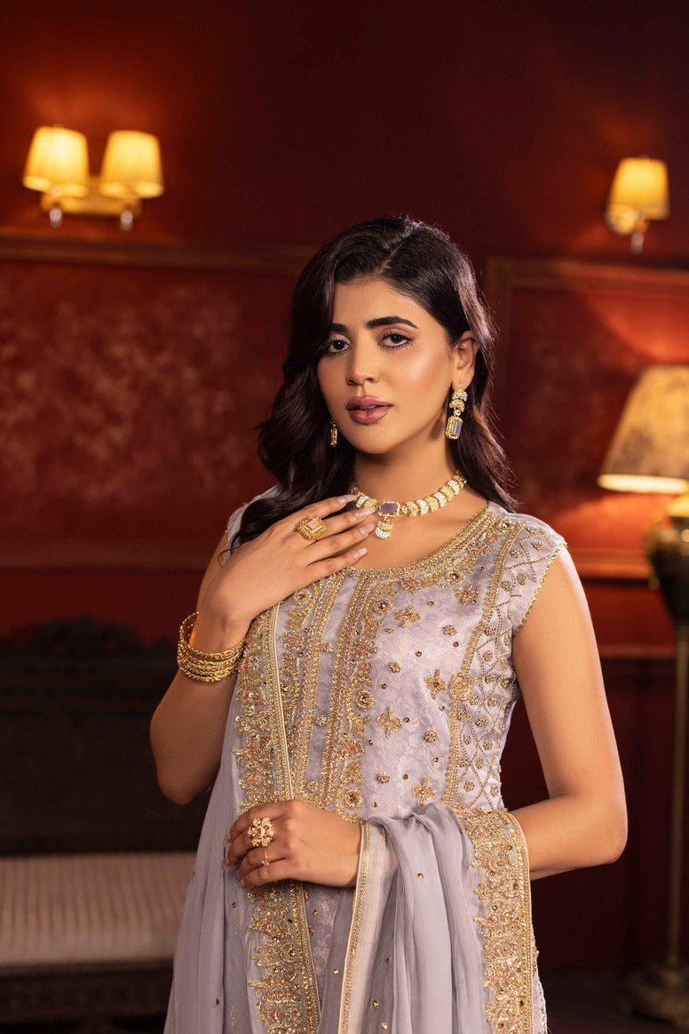 This elegant outfit is a deep mauve traditional ensemble with intricate gold embroidery and embellishments. The sleeveless kameez features a heavily embroidered bodice and a rich, textured pattern cascading down to the hem, which is adorned with delicate gold detailing. The matching dupatta is gracefully draped, edged with fine embroidery that complements the ensemble. The look is completed with flared pleated sharara pants, adding a regal and sophisticated touch. Styled with statement jewellery, this outfit exudes timeless grace and luxury, perfect for festive occasions and formal gatherings.