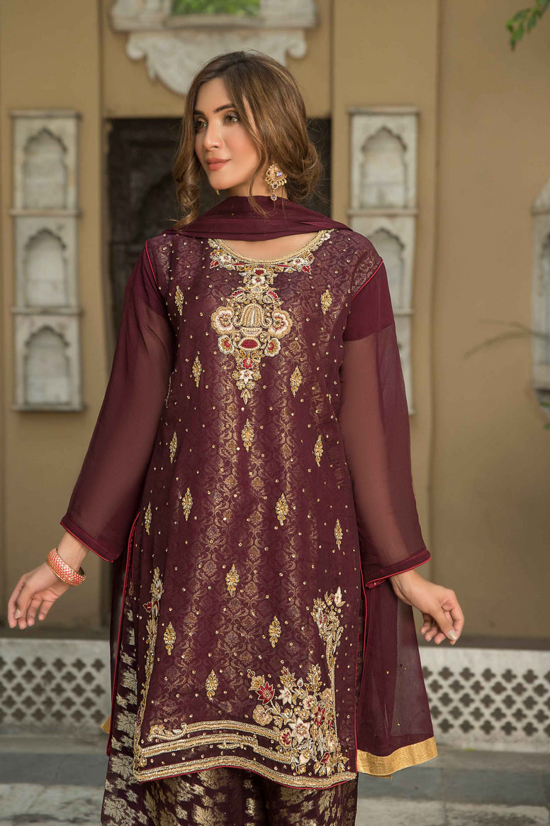 This deep burgundy velvet sherwani exudes sophistication and grandeur. The rich fabric is adorned with intricate gold and silver threadwork, creating a regal contrast that catches the light beautifully. The tailored fit enhances the silhouette, while the mandarin collar adds a modern touch. The sherwani is further complemented with a matching dupatta, edged with fine embroidery. Perfect for weddings and festive occasions, this outfit offers a luxurious statement for any groom or distinguished guest.