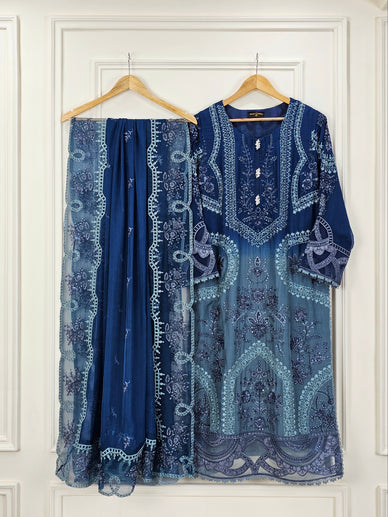 Step into timeless elegance with our Midnight Blossom 3-Piece Suit. Crafted on premium chiffon with intricate thread embroidery, this outfit is designed to make you stand out effortlessly. The soothing shades of deep blue, paired with delicate detailing, create the perfect blend of sophistication and grace.