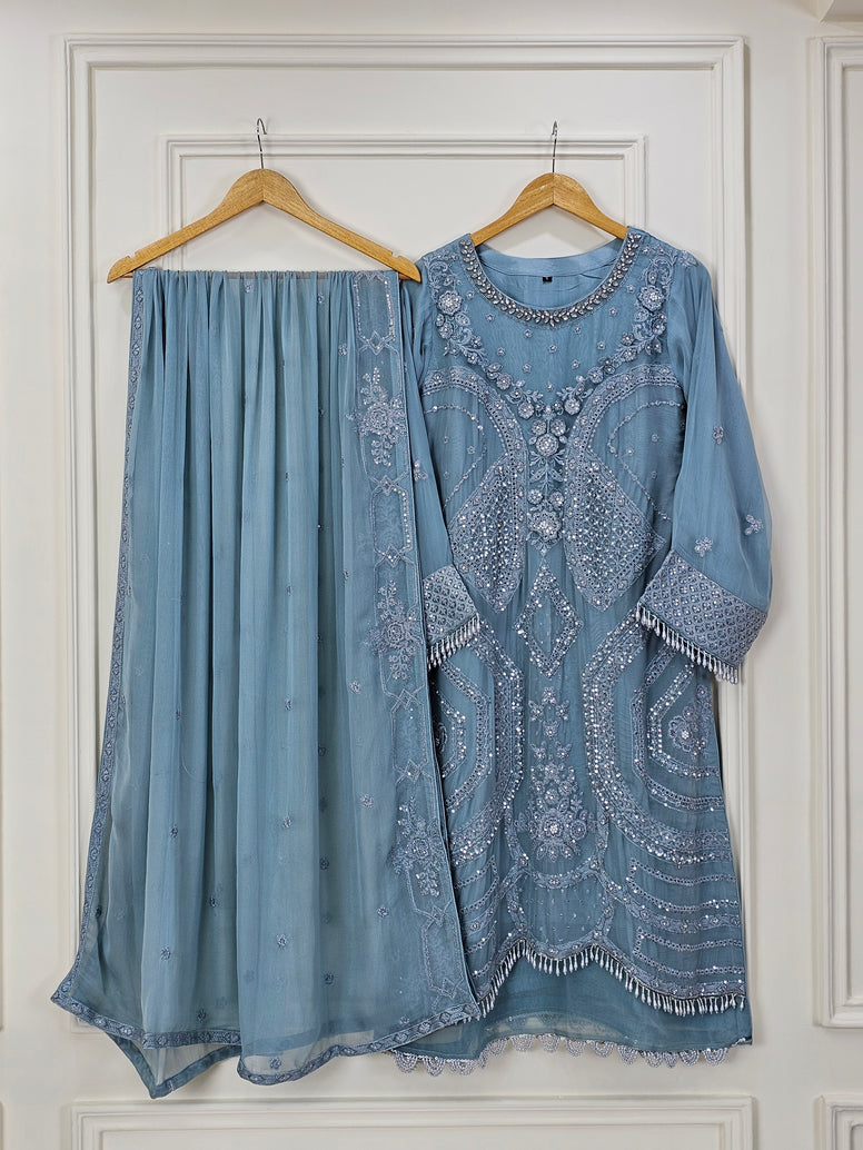 An epitome of grace, this heavily embroidered suit features intricate thread and zari work that beautifully adorns the entire ensemble. Rich detailing on the neckline, sleeves, and hemline adds regal charm, making it perfect for grand celebrations and festive occasions.