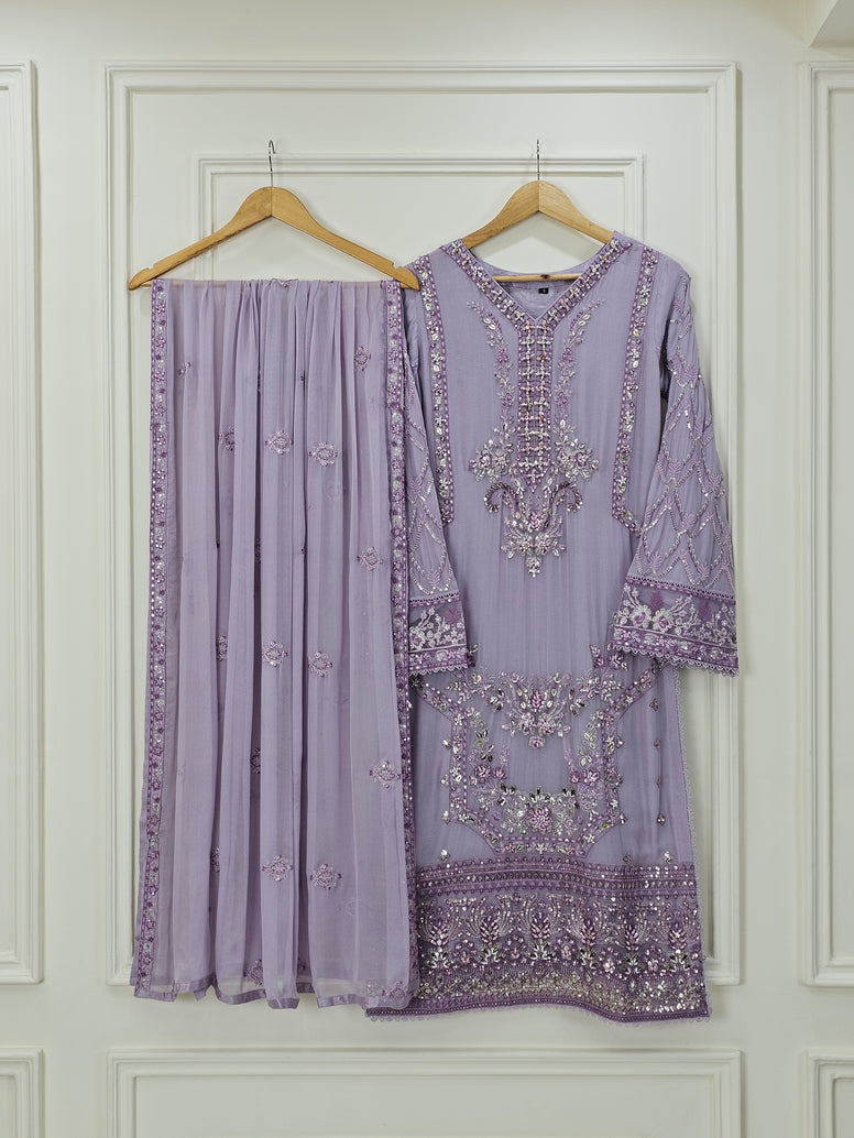 Make a graceful statement with this premium embroidered suit, adorned with exquisite motifs and rich craftsmanship. Its refined silhouette and elegant embroidery give it a regal appearance, making it your go-to outfit for celebrations, weddings, and evening events.