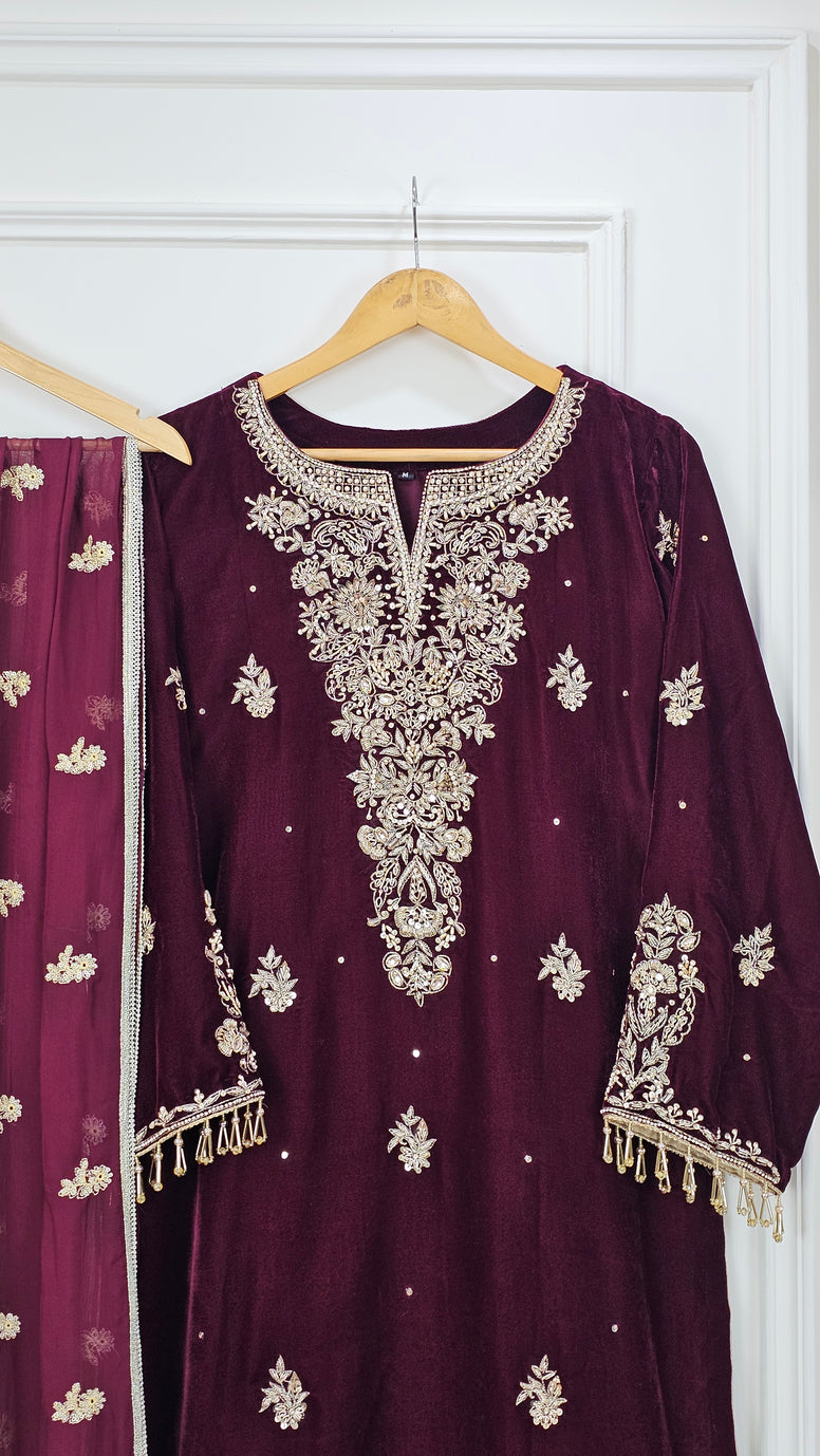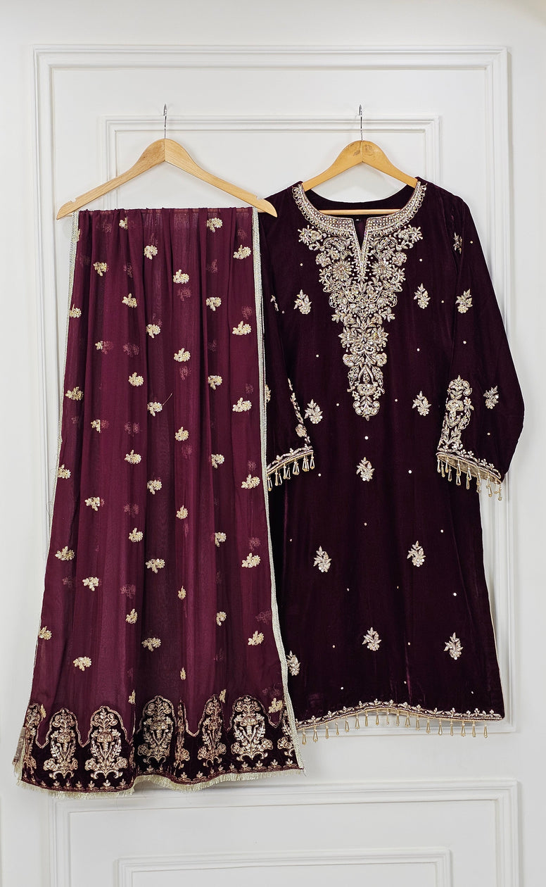 Drape yourself in royal elegance. This Velvet Jora , adorned with intricate golden zari and crystal embroidery, is a timeless celebration of luxury and grace & perfect for winter  and festive evenings.