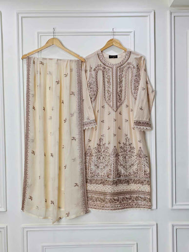 This three piece suit offers the perfect blend of comfort and elegance. Made from high quality cotton, it is soft and breathable, making it perfect for any occasion. The chiffon dupatta adds a touch of sophistication, making this suit a must-have for any wardrobe.