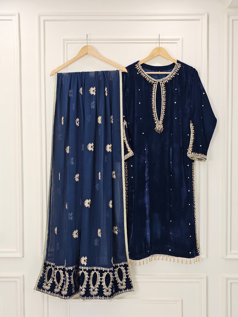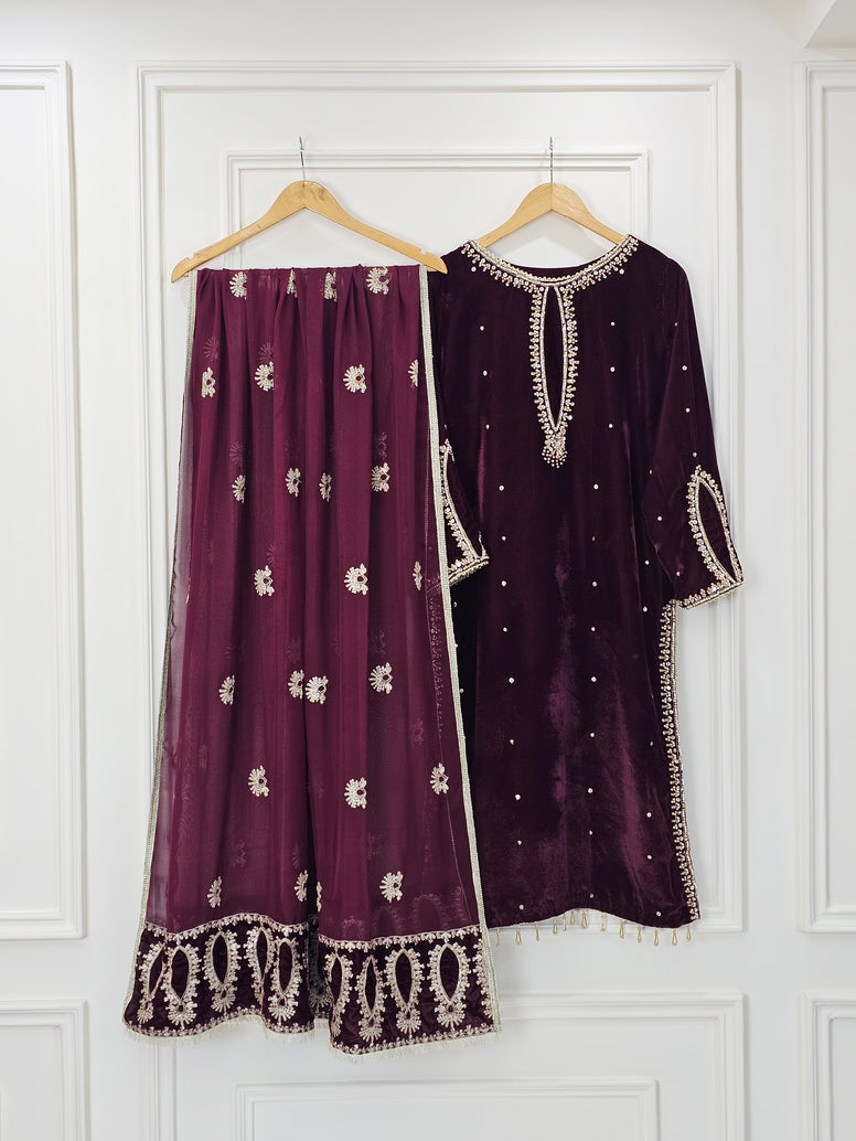 Experience timeless elegance with our handmade velvet suit, crafted to perfection for the modern woman who loves classic charm. The rich velvet fabric is adorned with delicate handcrafted details, giving it a luxurious touch and soft regal glow. Perfect for winter soirées, festive gatherings, or evening wear.