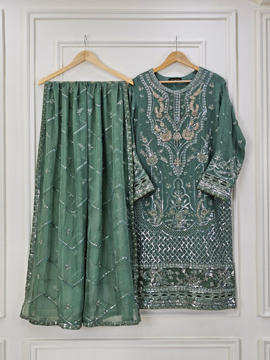 This heavily embroidered suit is a true statement piece, featuring exquisite craftsmanship on premium fabric. The intricate embroidery using zari, resham, pearls, and sequins, creates a breathtaking design that catches every eye. The richly detailed neckline and sleeves add a touch of royal charm, making it ideal for weddings, receptions, and festive gatherings.
